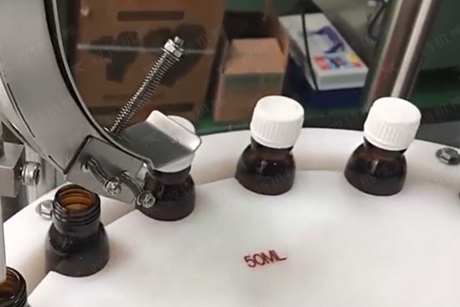旋蓋機(jī)主要用于玻璃廣口瓶的三、四、六鐵蓋真空旋蓋,用兩根不同速度的皮帶壓瓶蓋,因兩根皮帶的速度不同,對(duì)蓋進(jìn)行搓蓋收緊達(dá)到旋蓋目的。在自動(dòng)上蓋之前對(duì)瓶口吹蒸汽加熱,吹掉冷空氣,換上高溫蒸汽,立即旋蓋,根據(jù)熱脹冷縮原理,蒸汽冷下來就自然形成了瓶內(nèi)真空,達(dá)到了真空旋蓋的目的。自動(dòng)旋蓋機(jī)可以和濃醬灌裝機(jī)、蜂蜜灌裝機(jī)、辣椒醬灌裝機(jī)組合在一起,形成一套全自動(dòng)灌裝設(shè)備,是現(xiàn)代調(diào)味品企業(yè)的得力幫手。